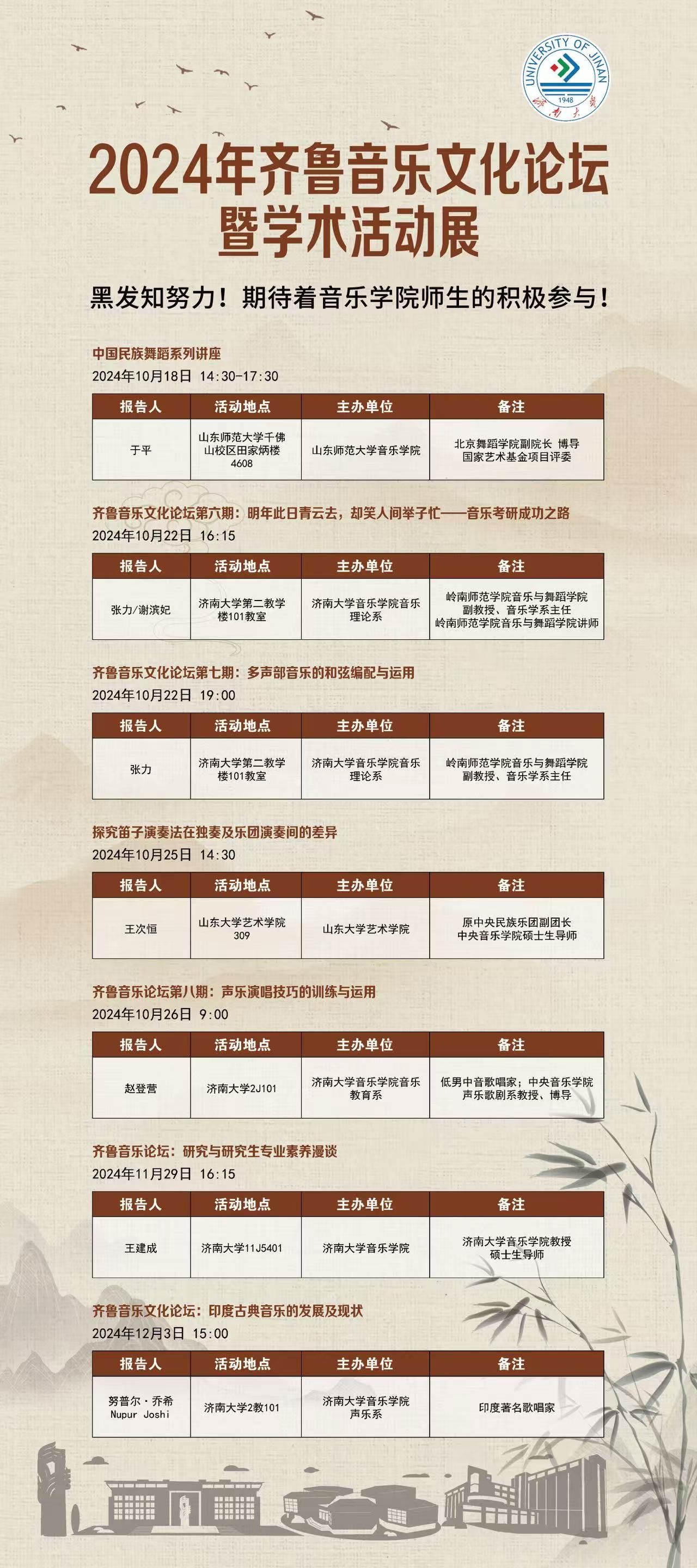 为营造浓厚的学术、科研、教研氛围,提高我校教学、科研水平,提升人才培养质量,进一步加强学科专业建设,增强对外学术交流的积极性,充分调动学生参与学术活动的积极性,电子竞技比分 2024年锐意打造学院学术品牌——齐鲁音乐文化论坛,在各系和兄弟学院的共同努力下,学院已成功举办齐鲁音乐文化论坛六场,秋季继续开讲,计划全年举办二十场。期待对齐鲁音乐文化感兴趣的广大师生积极关注、积极参与!