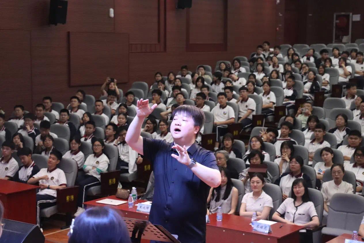 声乐系艺术指导闵小敏副教授,指挥山东泉城合唱团现场演绎《唱支山歌给党听》《爱永在》《再回首》《如果明天就是下一生》《知否知否》《莫吉托》《世界赠予我的》7首经典曲目,展现合唱艺术的多元魅力。讲座现场,同学们全神贯注,掌声雷动。当田浩老师抛出专业问题时,大家积极互动,现场气氛热烈而充实。报告结束后,意犹未尽的同学和老师们积极提问,现场交流氛围十分融洽。这场讲座不仅让邹平市高中学子近距离领略了音乐名家的风采,更为他们埋下了艺术梦想的种子,注入了追梦前行的力量。