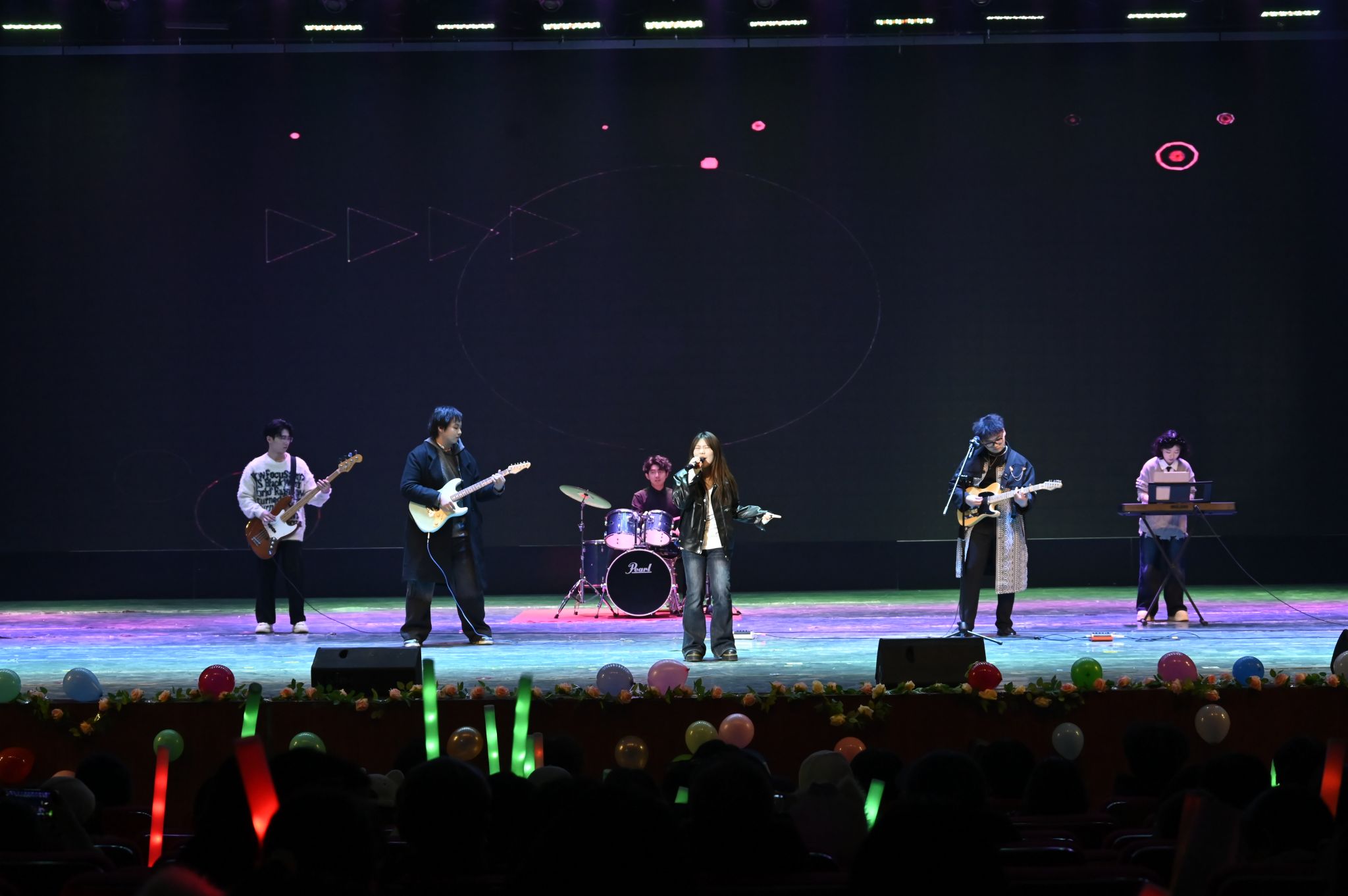 校院两级十佳歌手苏咏琪、时博演唱的回春丹乐队爆款歌曲《鲜花》,以温暖而深情的嗓音,唱响了对美好生活的热爱与对未来绽放的无限憧憬,二人高水平的演唱将会场气氛推向顶峰。