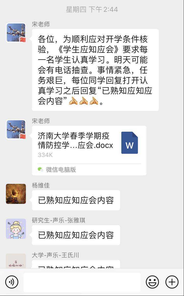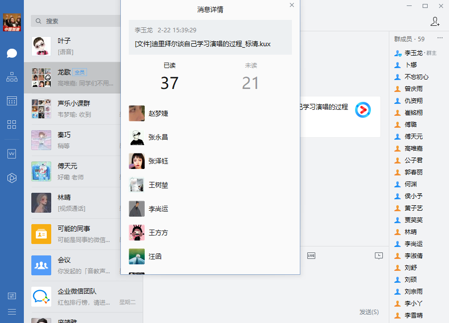“多方探索,精准施策”——因为是一对一教学,网络授课还算比较成功,但也出现了一些新问题。比如学生的音准问题等,李玉龙老师开发了更多的功能以辅助声乐教学,可以将网络上有价值的教学视频在群里分享给学生,实时查看到已读和未读的学生,便于及时掌握学生的学习状态。