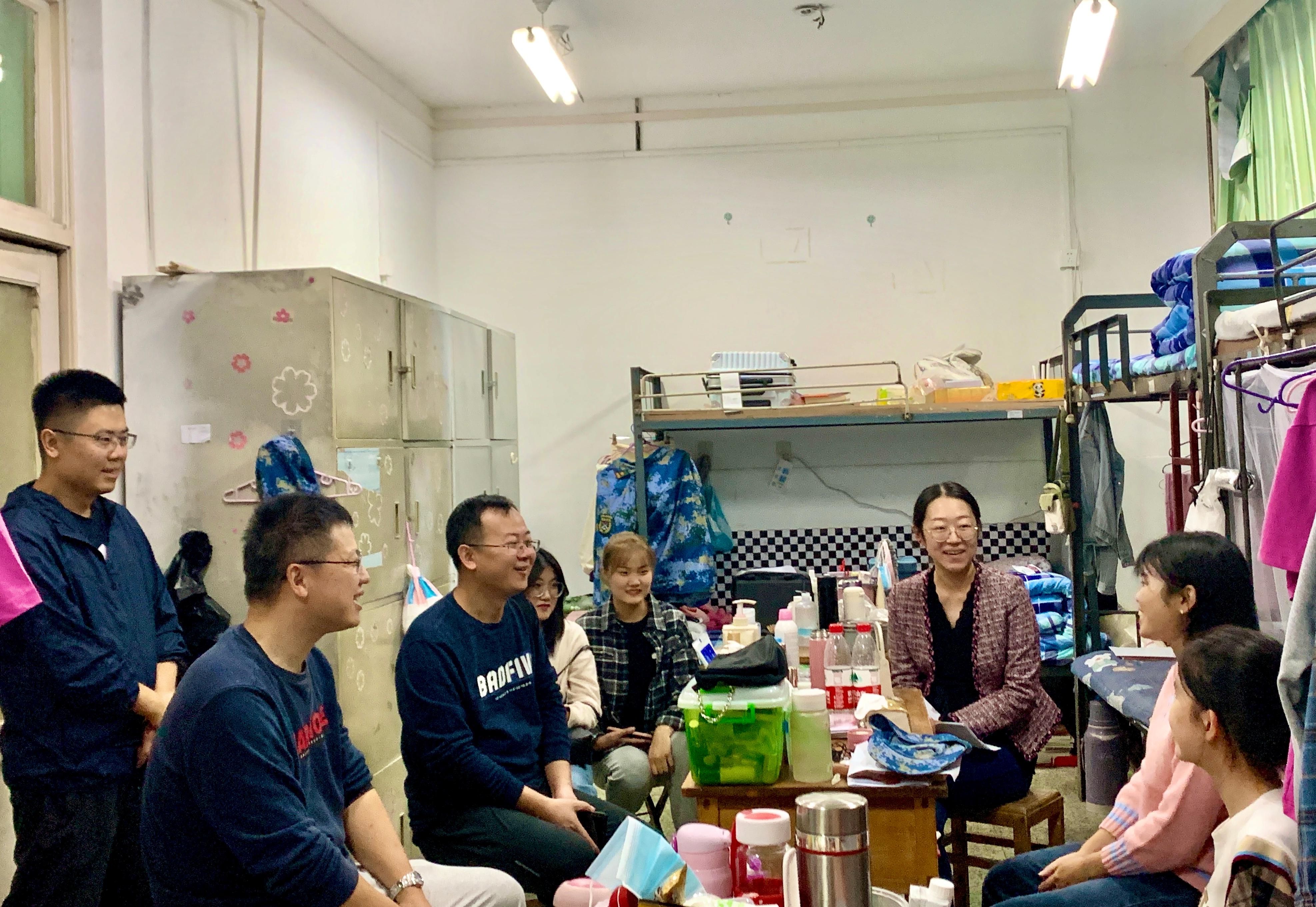 每到一个学生宿舍,刘书记一行与学生进行亲切交谈,向第一次在大学过中秋节的新同学及家人致以节日的问候,并和他们聊起了家常:“给没给家里打电话”、“想不想家”。看到学院老师的到来,学生们没有一点陌生感,就像见到自己的家人。