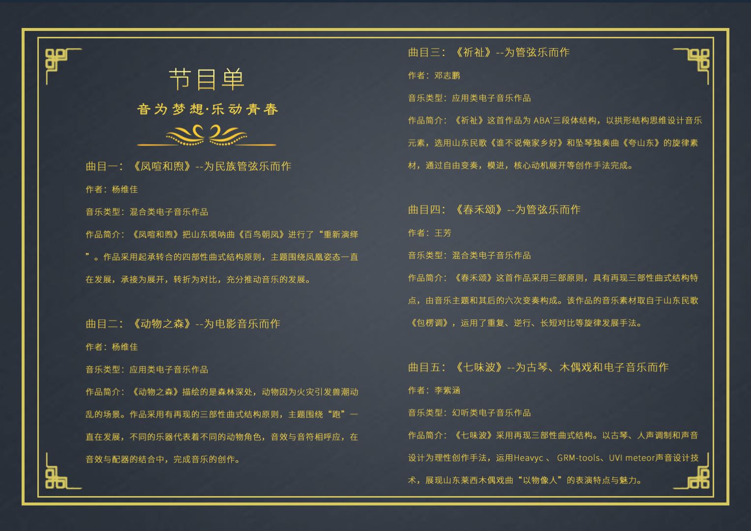 此次音乐会共有五首作品首演,由郑中教授指导完成。作品以幻听类电子音乐、管弦乐、应用类电子音乐等不同作品形式呈现,以传统作曲手法为原则,音乐科技手段为支撑,在保证作品可听性的同时,更好的诠释作者心中所思所感。《凤喧和煦》颇具创新精神,时而张力十足,时而轻松愉悦,期许凤凰涅槃的力量鼓舞我们继往开来。《动物之森》整首作品运用碎片化的音乐素材及多样化的音效片段试图将音乐构建成开放的音响系统,触发听众的联觉,进而引领听众进入变化缤纷、万象多姿的音响世界。同时,作者也借助该作品表达了对2020年澳大利亚火灾中逝去生命的悲痛之情。《祈祉》为管弦乐而作,旋律悠扬,节奏铿锵,乐器之间配合张弛有度,富有歌唱性,祈愿人民战胜苦难,重获平安。《春禾颂》以中国传统民族乐器笛子为主奏乐器,曲调古朴,音韵相合,在不断循环的主题之上进行变化发展,表现禾苗经过风雨的洗礼,焕发出勃勃生机。《七味波》此作品以古琴、人声调制和声音设计为理性创作手法,用多种声音材料的运动打造不同声音空间,渲染具象抽象意境交织的氛围,展现山东莱西木偶戏曲“以物像人”的表演特点与魅力。本场音乐会以导聆形式进行,音乐会作品以山东风格音乐为素材进行创作,为疫情中的人们送去心灵上的慰藉,鼓舞人们在疫情之后重燃对美好生活的憧憬与向往。