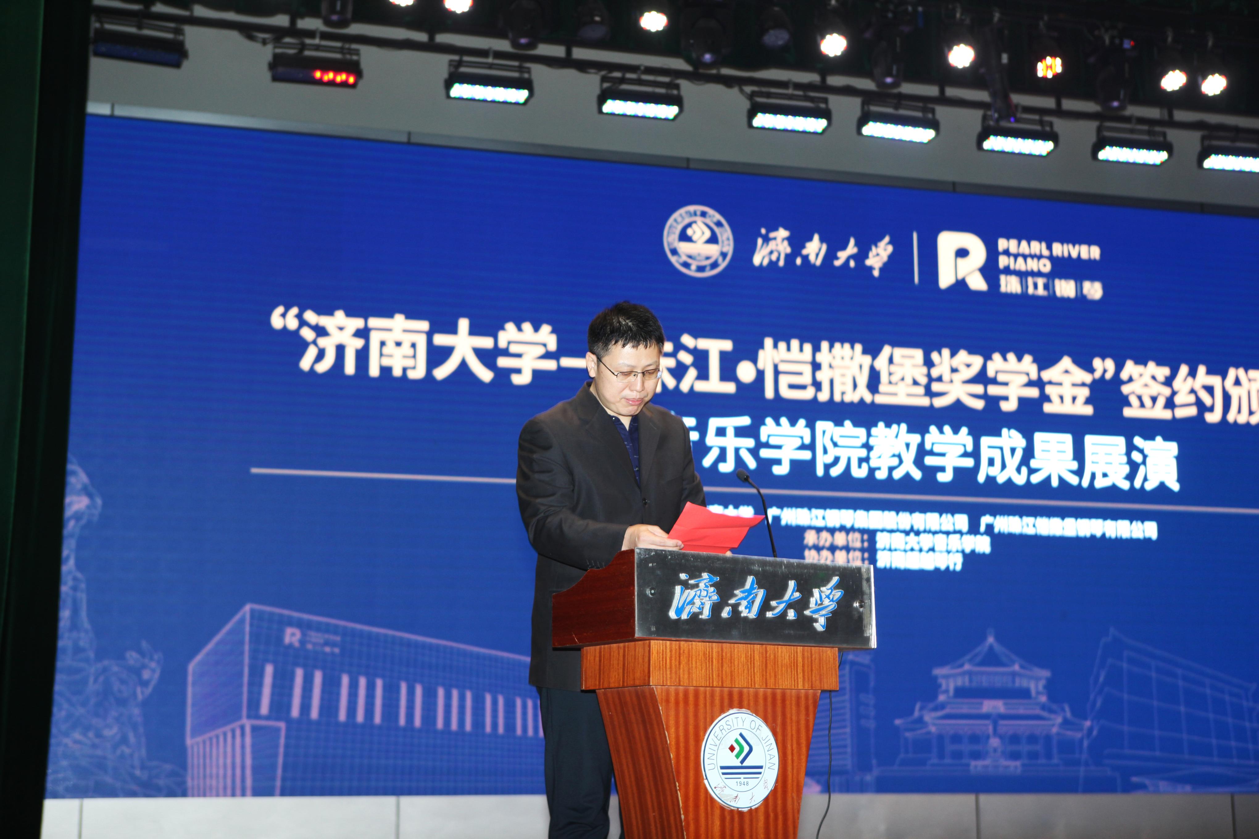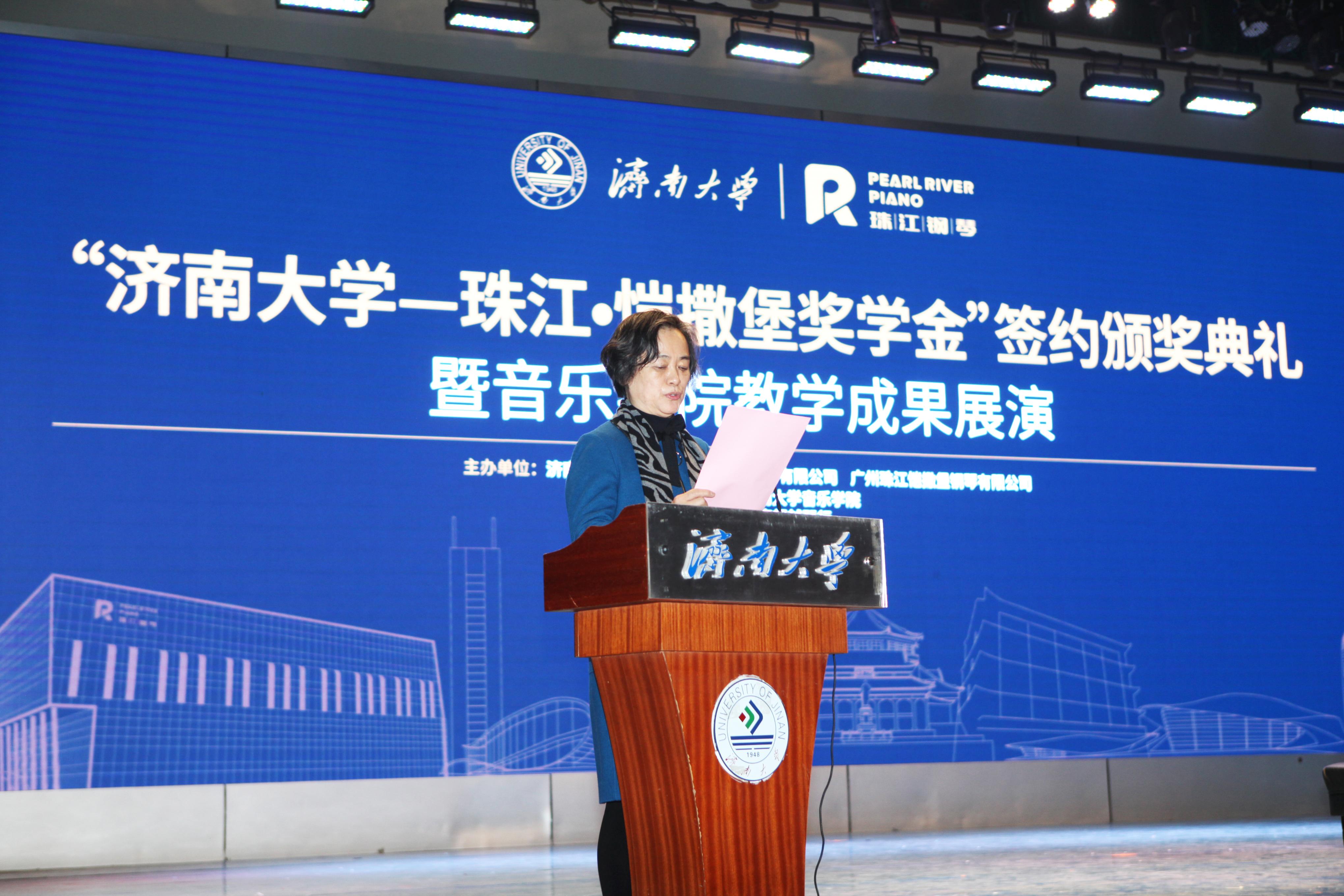 济南大学党委副书记张硕秋首先致辞,张书记代表学校向多年来关心、支持学校发展的珠江钢琴集团表示崇高的敬意和衷心的感谢,并介绍了学校在人才培养、师资队伍建设、高水平学科建设的基本情况。她指出,济南大学始终坚持开放办学模式,坚定不移地推进产教融合发展,电子竞技比分