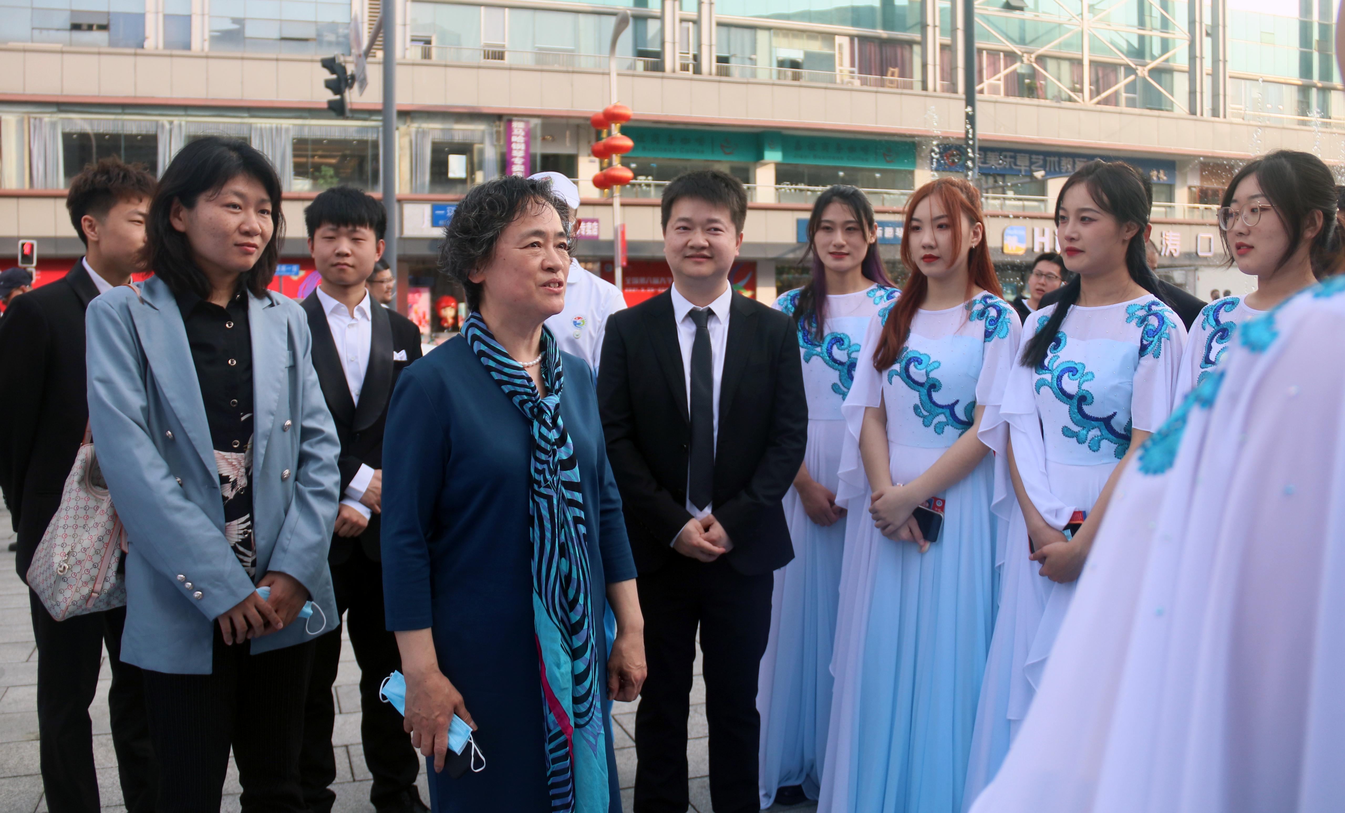 “山东泉城合唱团”,为观众带来了两首无伴奏合唱作品。《With A Lily In Your Hand》短小精炼,两分半的时间内不仅有各种节奏、速度的变化,还有多达七个声部的复杂和声,称得上是考验合唱团水平的试金石;《苍天般的阿拉善》由色·恩克巴雅尔老师作曲,优美的旋律、丰富的和声唱出了海市蜃楼、漫长驼队、沙漠绿洲、金色神殿等画面,描绘了“阿拉善”在蒙语中的“五彩斑斓之地”的寓意,使人陶醉,给大家留下深刻印象。展演现场,山东省教育厅副厅长孙晓筠与张硕秋副书记交谈中,对我校参演同学的表现给予高度评价,充分肯定了我校的美育工作,希望我们总结经验,凝练美育工作特色,培育更多的美育工作成果,突出美育在“青年政治”人才培养中的作用。