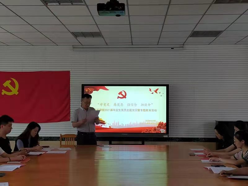 学院党委副书记、副院长袁海占首先对全体毕业生党员圆满完成学业表示祝贺,对他们即将走上工作岗位、开启人生新的征程表达了衷心祝愿。在即将迎来中国共产党建党一百周年之际,他对毕业生党员提出四点明确要求和殷切希望:一是要不忘初心使命,牢记党员身份,做到在党言党,在党爱党,在党忧党,在党为党。二是要加强党性修养,坚定理想信念,补足精神上的‘钙’。三是要保持终身学习,淬炼品德修为,并努力把学识理论转化为工作实绩,做到学以致用、用有所成。四是要铭记饮水思源,心存敬畏、学会珍惜、懂得知足,常怀感恩之心。他强调,毕业生党员要切实强化“一个党员就是一面旗帜”的责任担当,牢记党员身份,增强党员意识,履行使命担当,在毕业离校中“站好最后一班岗”,做榜样、做表率,配合老师做好毕业生离校前的各项工作,做文明离校的楷模。