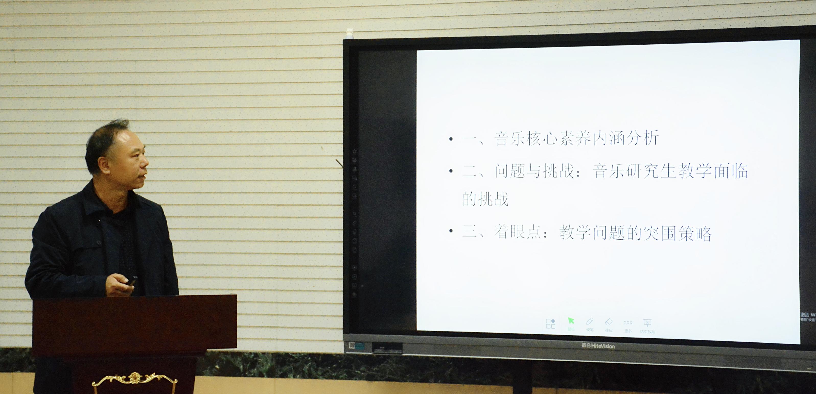 王建成副院长着重从核心素养的内涵培养进行阐述,提出“1+X”的音乐技能构成要素,指出教学中存在“三个分离”——理论与实践分离、专业与文化分离、教学与学术分离的情况,分析了音乐专业学位研究生教学所面临的问题与挑战,并提出相应的应对策略。