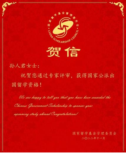 孙人君老师喜获国家留学基金委公派全额资助,将赴瑞士开展为期一年的访问与交流。