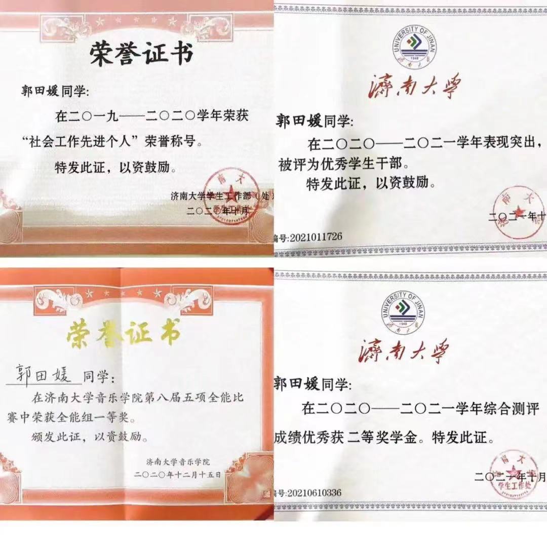 2020—2021学年:获得济南大学二等奖学金、优秀学生干部、五项全能综合一等奖、山东省第六届大学生艺术展演活动一等奖