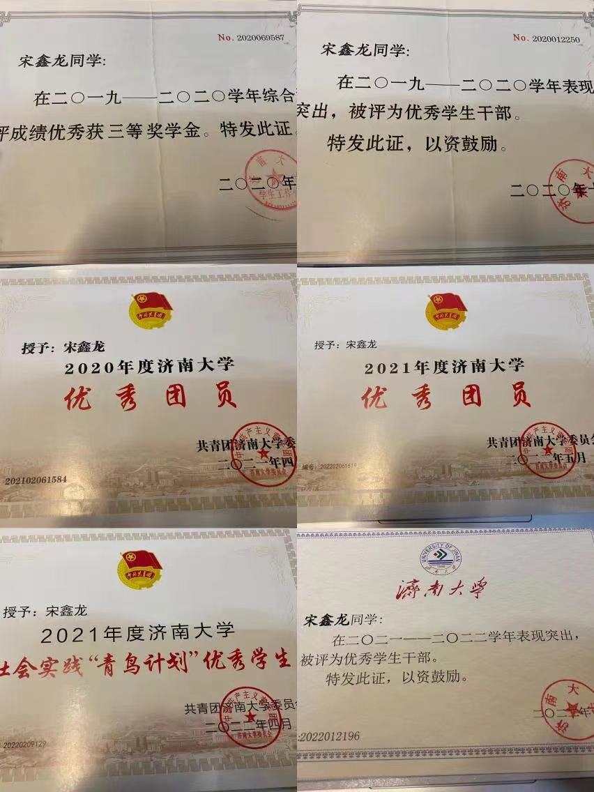 2021—2022学年:二等奖学金、优秀团员,“青鸟计划”优秀学生, 济南大学青马班第十一期学员、济南大学疫情防控志愿者