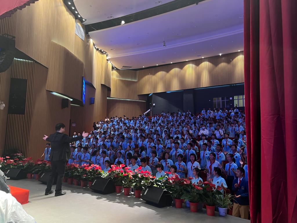 相关负责人及青年教师田浩出席活动,济南新航实验外国语学校部分教师代表和500余名学生现场观看音乐会。