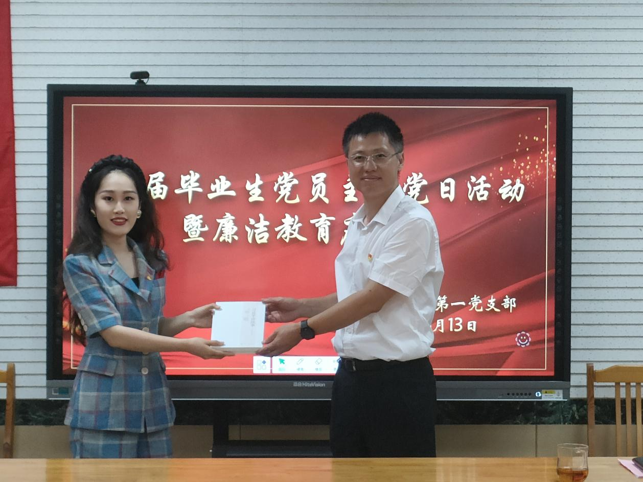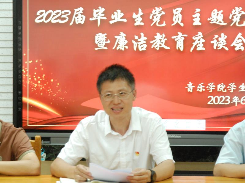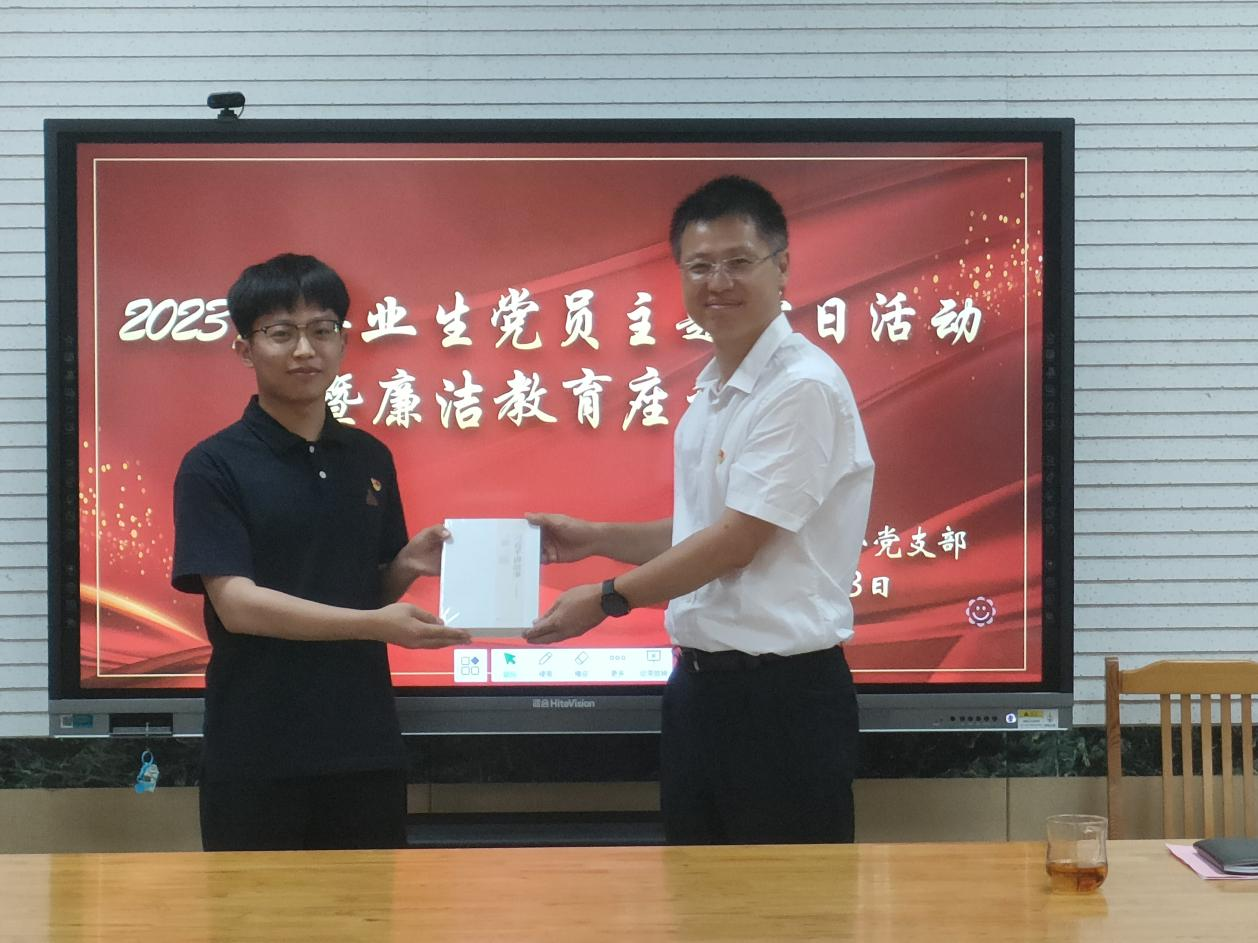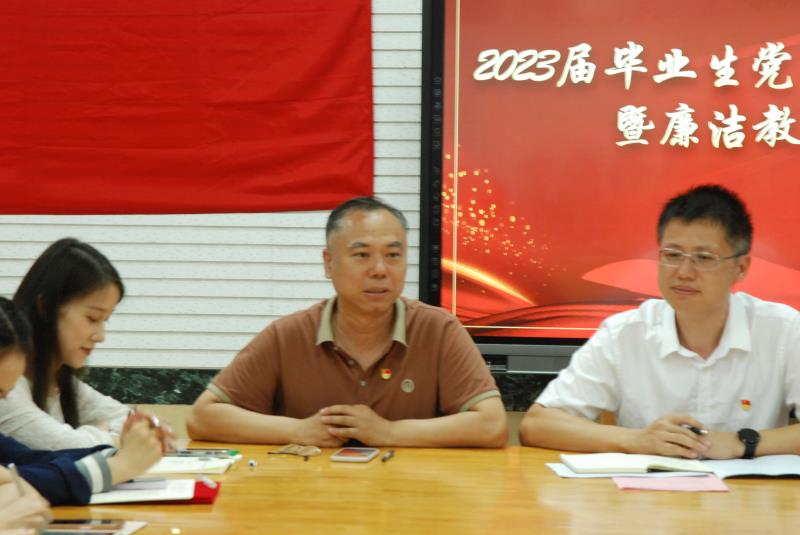 随后,学院党委副书记、副院长郝伟为毕业生党员做廉洁教育。古人云:贪如火,不遏则燎原;欲如水,不遏则滔天。他强调,身为一名党员,要有着廉政、廉洁、自律的品质,并告知大家淮海战役的胜利,正是因为解放军有着廉洁、自律的优秀品质,所以才出现了“军爱民,民拥军”的局面。同时,郝伟对毕业生党员提出了几点要求:首先,要知敬畏,要有纪律意识和规矩意识,时刻保持清醒的政治头脑,牢记全心全意为人民服务的宗旨;其次,要守底线,要保持政治底线,在学习、生活和工作中要做到“不以恶小而为之,不以善小而不为”。最后,他对毕业生党员送上了美好的祝福,祝福大家大展宏图,鹏程万里。