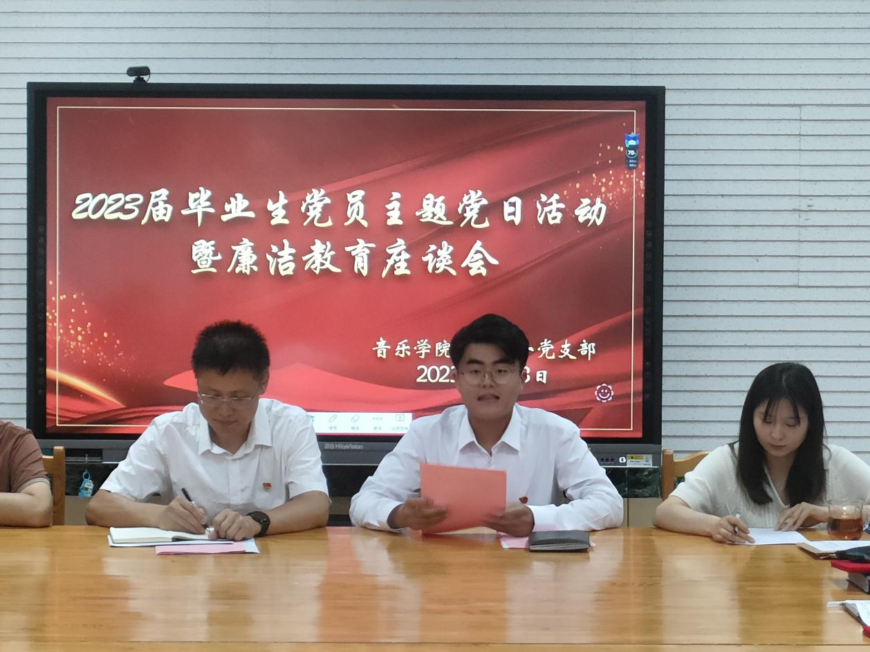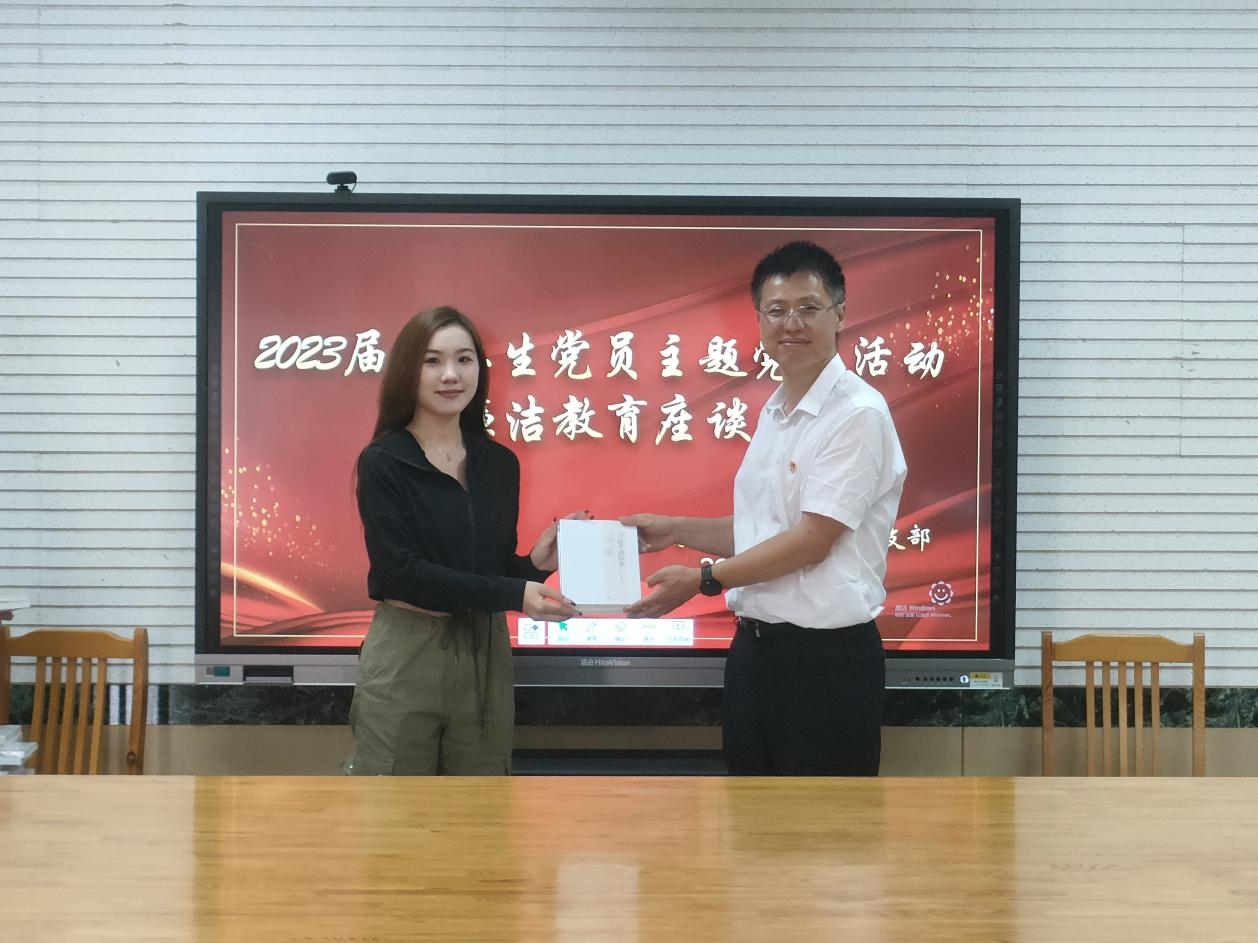 在研讨课教室举办2023届毕业生党员主题党日活动暨廉洁教育座谈会。学院党委书记刘振、党委副书记郝伟、学院副院长王建成、学院学生办公室主任孟凡星、辅导员宋莉璐以及2023届毕业生党员出席了本次座谈会。本次会议由学院学生第一党支部书记孙燕丽主持。