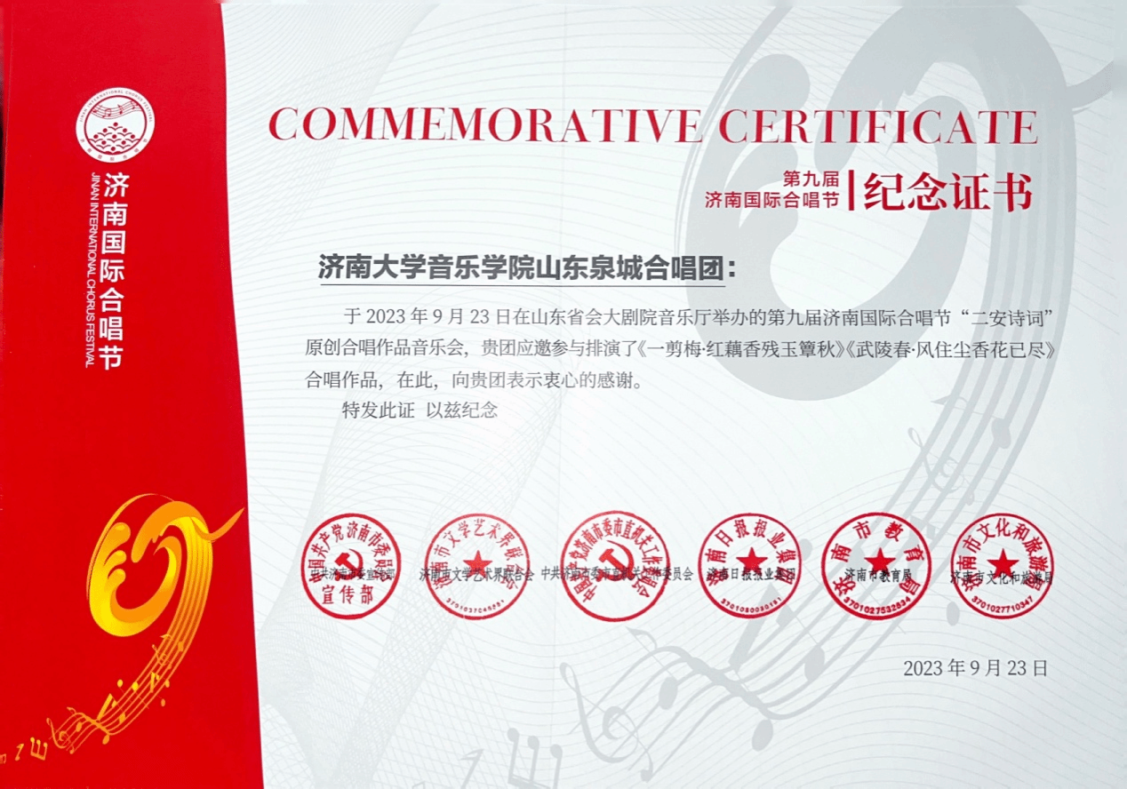 山东泉城合唱团受邀参加了第九届济南国际合唱节“二安诗词”原创合唱作品音乐会。此次音乐会以”合唱+诗词”方式充分展现济南“二安”文化的诗性智慧和精神魅力,助力打造全国“二安”诗词文化“两创”新高地。