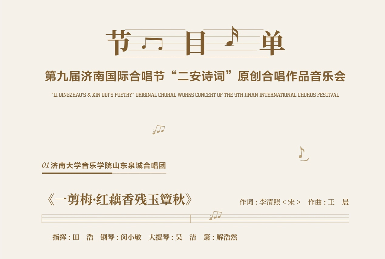 青年教师田浩老师指挥、闵小敏老师担任艺术指导,同时在解浩然同学的助演下,合唱团完美演绎了由王晨作曲的《一剪梅·红藕香残玉簟秋》,这是李清照新婚燕尔思念丈夫赵明诚写下的一首词,婉转含蓄,唯美隽永。全词以花喻人,一气呵成,将瞬间情绪付诸笔端,展现易安词独特之美。