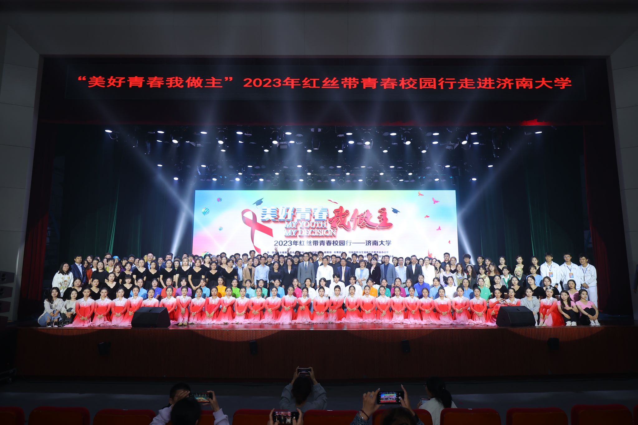 在器乐、声乐和舞蹈等各个专业方向的人才培养质量,同时展现出学院师生的大局意识、艺术水准、专业素养和积极昂扬的精神风貌,也为此次红丝带青春校园行走进济南大学活动增添了明亮的一抹色彩。