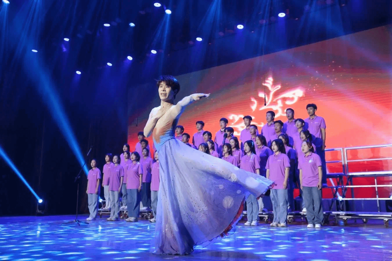 新生合唱团作为表演队伍最后一个登场,选择歌曲《领航》作为展演曲目。演出创新表演形式,融入架子鼓、舞蹈等元素。随着闵小敏老师钢琴伴奏声响起,优美的舞蹈率先引来观众的阵阵呼声,随后同学们精神饱满,意气风发,纵情高唱嘹亮的歌声将对党的热爱随着音符洒满整个礼堂,用歌声号召青年们朝着伟大目标砥砺前行。歌声郎朗、掌声阵阵,现场观众跟随着经典歌曲重走峥嵘岁月、感悟薪火盛世。
