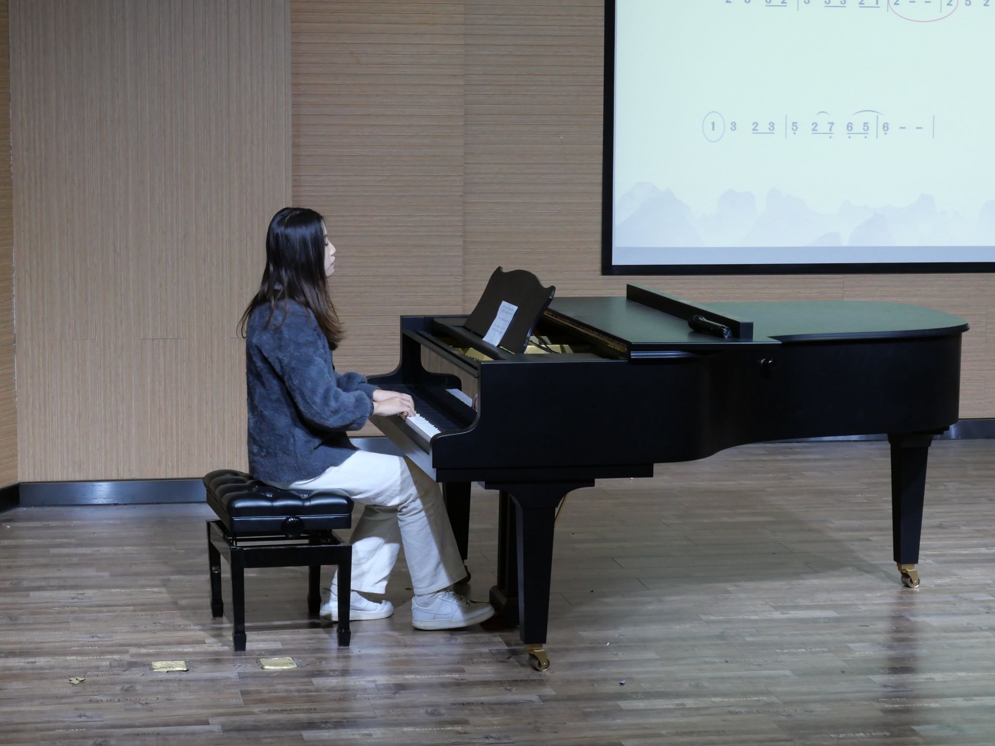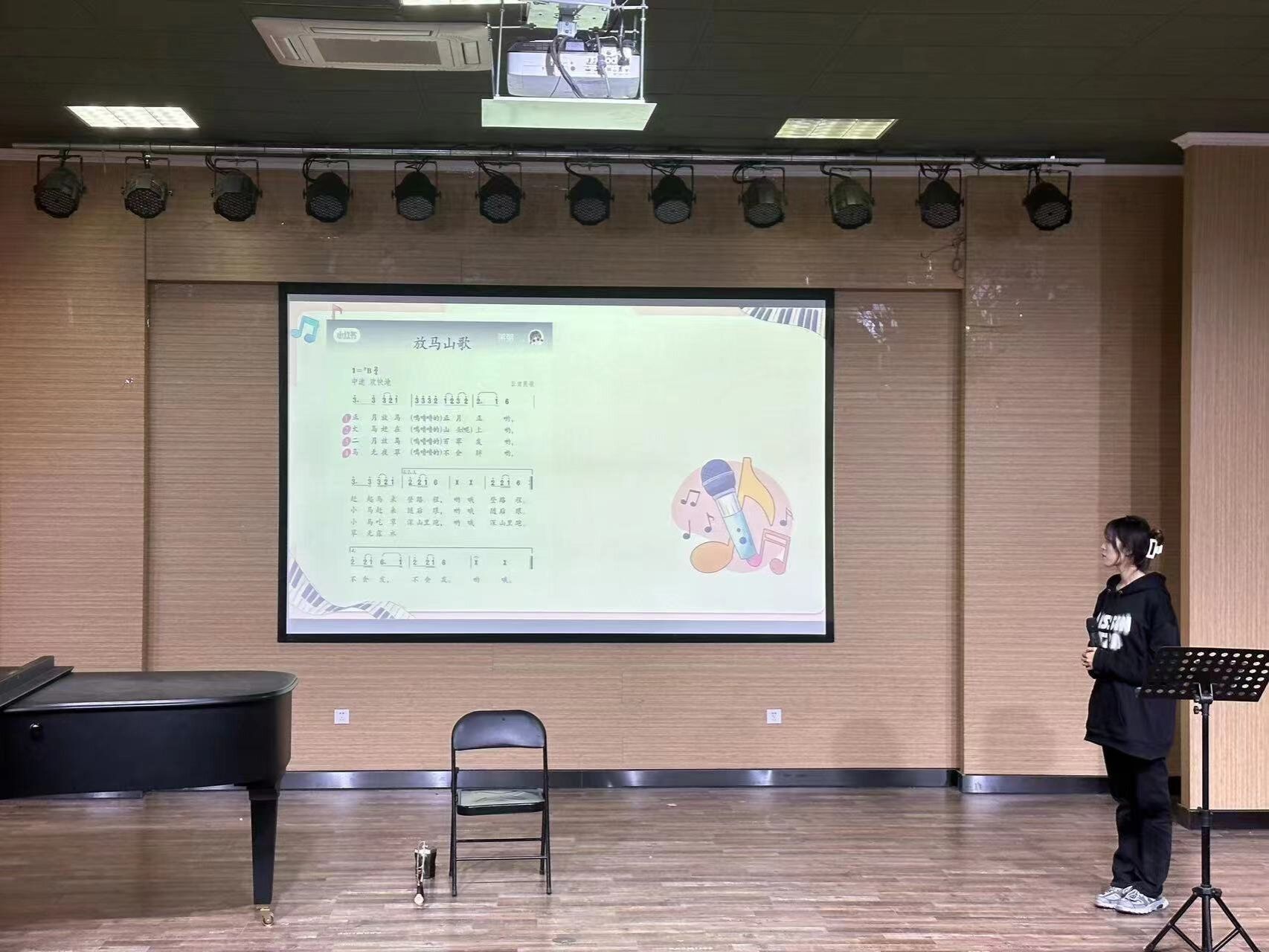 首先,孙琦同学带领学生们走进云南民歌《放马山歌》,感受当地淳朴敦厚的民俗民风并将民族乐器二胡与山歌相结合,通过风景观赏、山歌多元化欣赏等方式激发学生学习兴趣。鲍蓉同学在为学生们讲授《采花》时着重强调切分节奏知识,引导学生体会四川民歌特点。高瑞阳同学的民谣歌曲《外婆的澎湖湾》歌词朗朗上口,学生们通过挥舞手掌击打节奏的方式学习不同的节奏型,在师生交流互动的过程下营造出轻松愉快的课堂氛围。侯杰同学的《摇篮曲》借助钢琴和演唱示范,讲述了倚音、弱起等相关音乐知识。韩琳玥同学的《中国古典舞》课程将图片与视频相结合,教授了中国古典舞蹈的手型、脚型、手位及脚位,使学生们对中国古典舞有了初步的认识。庞雨同学所讲述的《沂蒙山小调》是一首优美抒情的山东民歌,将该音乐形象与地方文化融合,在拓展音乐思维的同时引导出学生们对地方民歌的浓厚兴趣。曹阳同学的《友谊天长地久》是一首三拍子的歌曲,从“友谊”两字切入,带领学生们感受真挚的友谊和惜别时的感情。