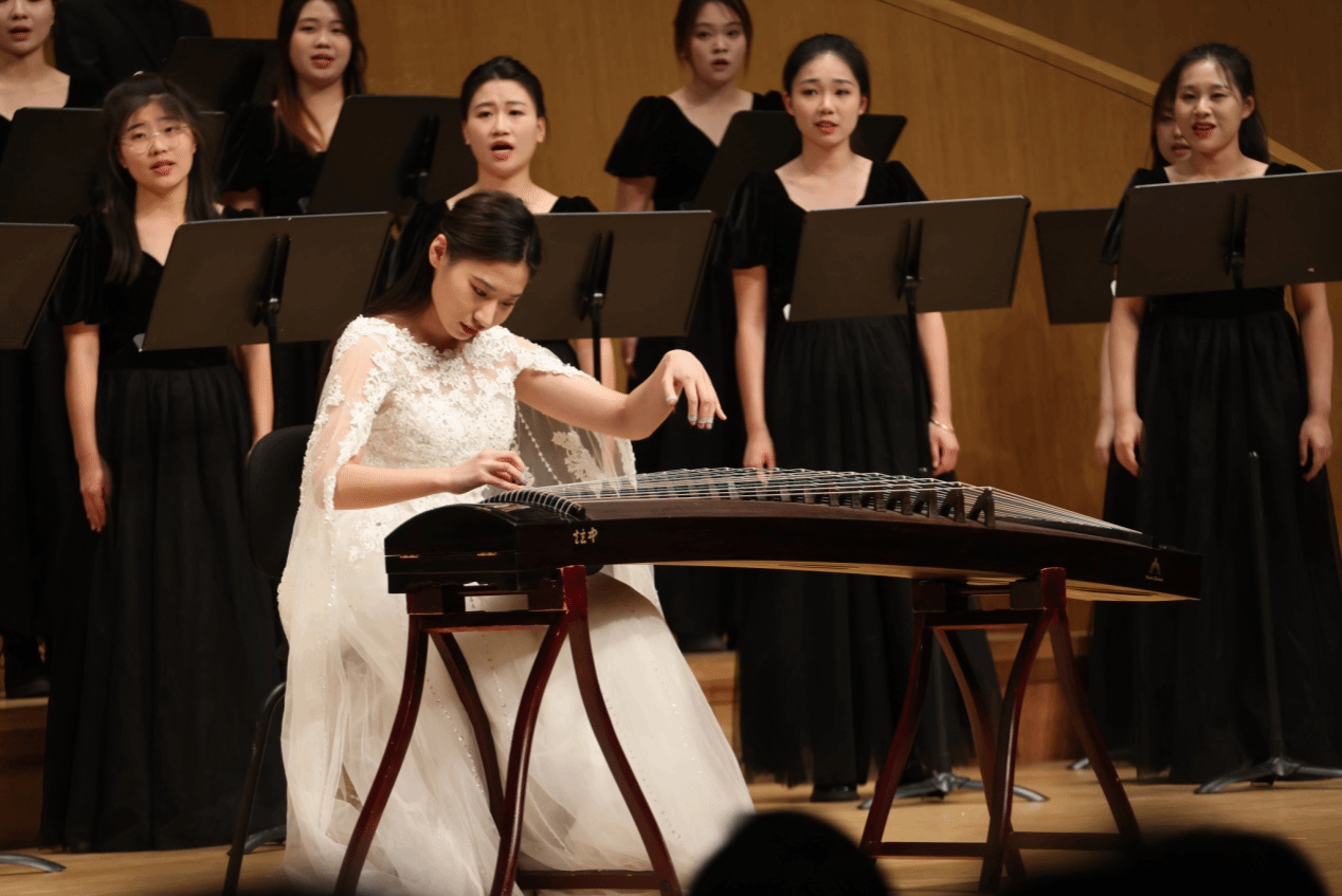 的师生们用合唱对经典诗词进行了审美阐释,长笛在《一剪梅-红藕香残玉簟秋》中如同天籁之音,音色清新脱俗;《醉花阴》让我们再次走进宋代女词人李清照的心灵世界,再现了相思与别愁的意象;《子衿》的浪漫气息充满了古典美的韵味,歌声展现了心中的渴望;《观沧海》则融合打击乐与多声部合唱,不仅展现了时不我待的紧迫感与共创一流的雄心壮志,更是借助合唱营造了意味隽永的意境。接下来的流行合唱将流行音乐的时尚元素融入多声部的编创,展现时尚灵动的气息和蓬勃向上的朝气,给人们带来全新的音乐体验。在“家国情怀”段落中,济大人歌以咏志,用《我站在铁索桥上》《沁园春·雪》《我的自白书》《我爱你,中国》《没有共产党就没有新中国》五首红色歌曲来缅怀革命前辈,传承红色文化,歌声中洋溢着对党的忠诚和对祖国的热爱。
