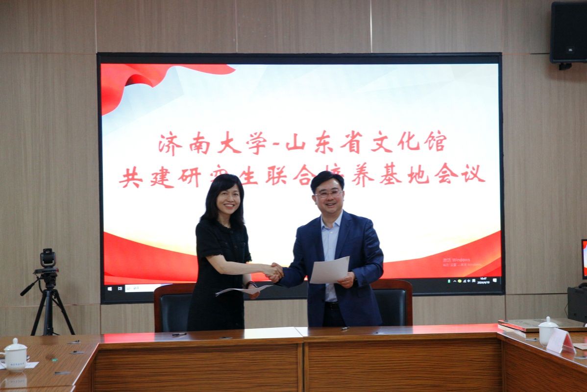 党委书记孙翔玲与山东省文化馆馆长赵新天签订济南大学-山东省文化馆共建研究生联合培养基地协议书,研究生院副院长杨立洁与山东省文化馆馆长赵新天共同为济南大学-山东省文化馆研究生联合培养基地揭牌。随后,与会人员就研究生联合培养基地之后的建设进行交流与研讨。孙翔玲表示,非常感谢山东省文化馆长期以来对学院研究生人才培养工作的大力支持。相信此次研究生联合培养基地共建,将对学院在深化研究生培养模式改革、强化研究生实践创新能力、提高研究生培养质量等方面起到重要的推动作用。杨立洁表示,研究生联合培养基地是培养专业学位研究生创新实践能力、服务社会能力的重要平台,研究生院全力支持基地的建设,双方可在导师聘请、研究生培养、实习实践等方面加深交流与合作。揭牌仪式结束后,参会人员在山东省文化馆各场馆进行实地考察。