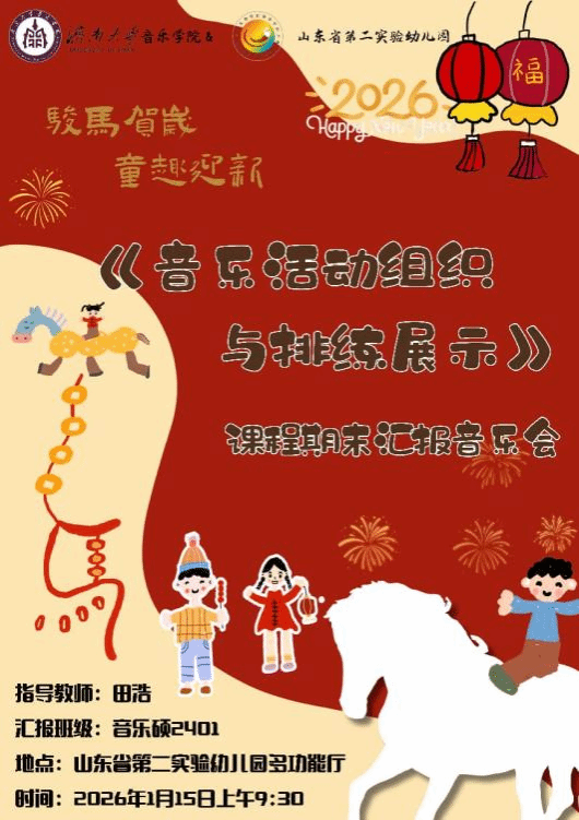 为深化音乐硕士实践育人成效,提升研究生音乐活动策划、编排与舞台呈现的综合能力,在本学期开设的《音乐活动组织与排练展示》课程中,田浩老师带领2024级研究生走进山东省第二实验幼儿园进行为期一学期的教学实践,并于2026年1月15日联合山东省第二实验幼儿园成功举办课程期末汇报音乐会。山东省第二实验幼儿园副园长刘菲、副园长郭志杰,济南大学研究生院副院长仲倩、培养办公室干事昃科萌,电子竞技比分