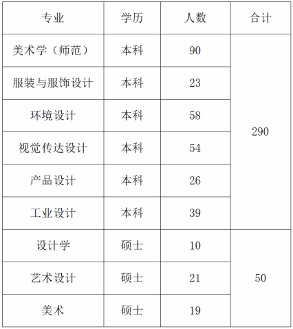 济南大学美术与设计学院始建于1987年。三十余年的办学历程中,学院始终立足社会需求和时代前沿,目前学院设6个本科教育招生专业:美术学(师范)、工业设计、视觉传达设计、环境设计、服装与服饰设计、产品设计,拥有2个硕士学位授权点:设计学一级学科硕士学位(学术型)授予点和艺术硕士(MFA)专业学位授权点(含美术和艺术设计两个领域)。学院2025届本科毕业生290人、硕士毕业生50人。信息如下: