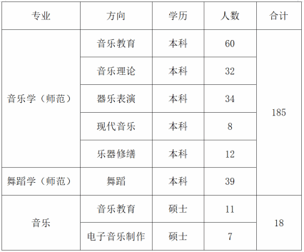 成立于2011年,现有音乐学、舞蹈学两个本科专业。下设声乐系、器乐系、键盘系、音乐教育系、音乐理论系、现代音乐系和舞蹈系七个系部。学院拥有艺术学一级学科专业硕士授予权、音乐评论——自主设置目录外二级学科硕士授予权,拥有硕士研究生免试入学推荐权。学院2025届本科毕业生185人、硕士毕业生18人。信息如下: