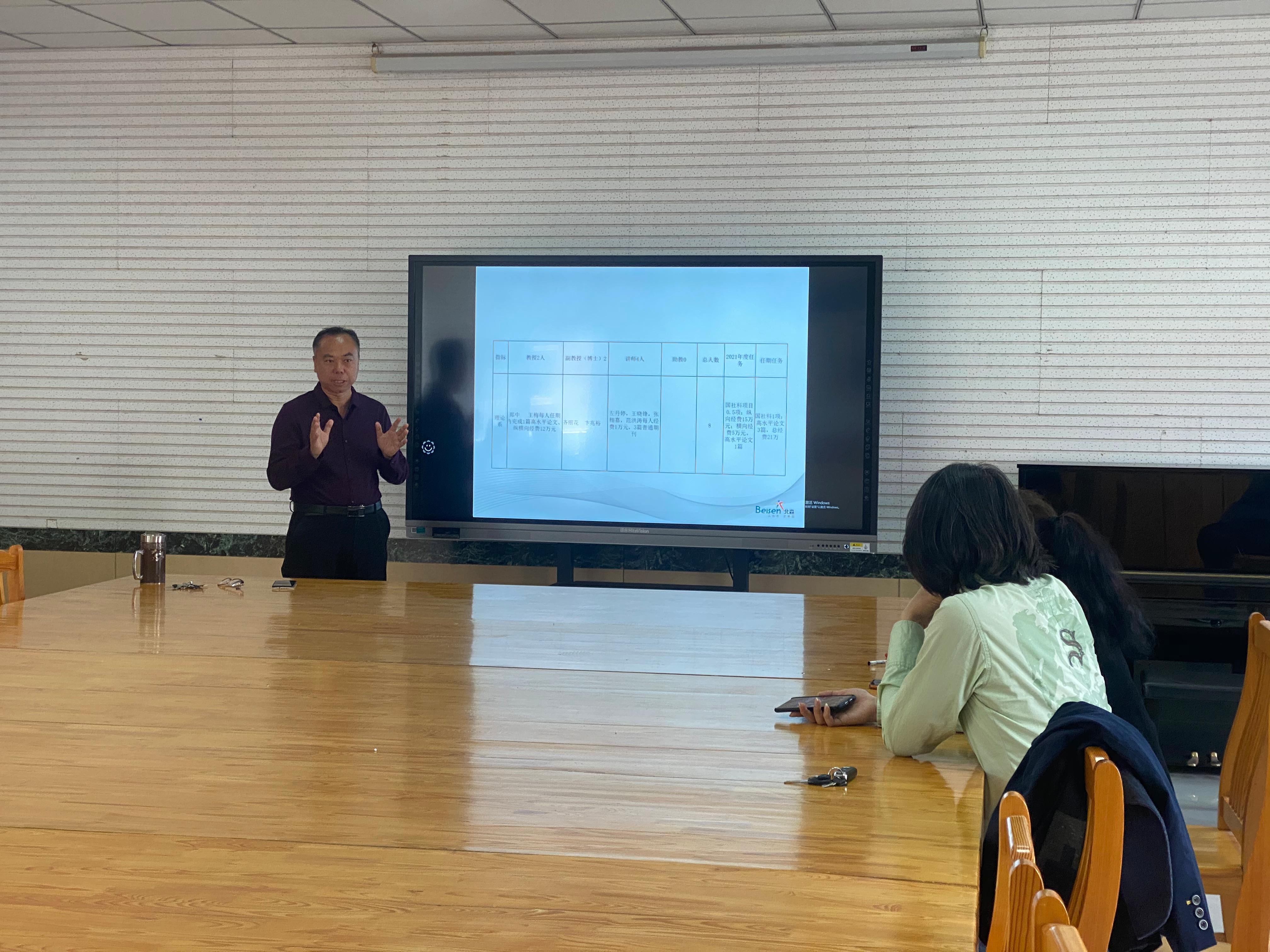 会上,王院长仔细讲解了目标任务分析(年度与任期)、科研团队构建/科研规划、横向项目与社会服务等方面的内容,大家听得非常认真。